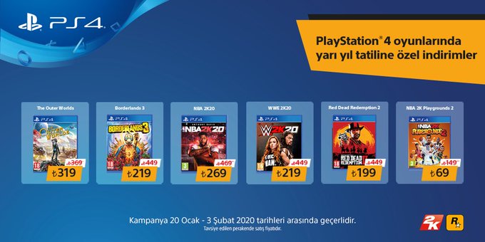 The Outer Worlds 369 TL yerine 319 TL, Borderlands 3 449 TL yerine 219 TL, NBA 2K20 469 TL yerine 269 TL, WWE 2K20 449 TL yerine 219 TL, Red Dead Redemption 2 449 TL yerine 199 TL ve NBA 2K: Playgrounds 2 149 TL yerine 69 TL.